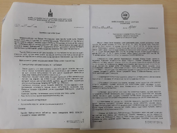– Нийслэлийн Засаг даргын Тамгын газрын 2021 оны 03 дугаар сарын 15-ны өдрийн 64 дугаартай Хяналт шинжилгээ, үнэлгээний ажлын зөвлөмжийн хэрэгжилт, цаашид анхаарах асуудал